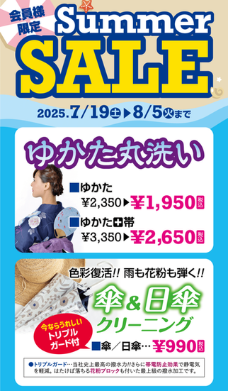 2025年 サマーセールのお知らせ7月18日≪会員様限定≫Summer SALE 【セール期間】7月19日(土)~8月5日(火)まで★ゆかた丸洗い・ゆかた:2,350円→1,950円(税込)・ゆかた+帯:3,350円→2,650円(税込)★傘&日傘クリーニング色彩復活!今なら雨も花粉も弾くトリプルガード付き・1本:990円(税込)※トリプルガードとは当社史上最高の撥水力を持ち、さらに帯電防止効果で静電気を軽減。はたけば落ちる花粉ブロックも付いた最上級の撥水加工です。★スニーカー機械洗い≪強力消臭・強力除菌・防臭&抗菌≫・スニーカー全サイズ 1足:390円(税込)※手洗いコース新設により機械洗いは破損、色落ち含め一切の補償対象外となりますので予めご了承のうえご依頼ください。★水性コート剤加工 ソフト99 クロスバリア≪スニーカーに撥水・撥油・防汚効果をプラス≫・加工料金:1足+350円→+200円(税込) ※セール期間中は通常納期と異なる場合がございます。※当店の定める特殊品を除きます。※本セール適用時にはクーポン等、他の割引との併用はできません。